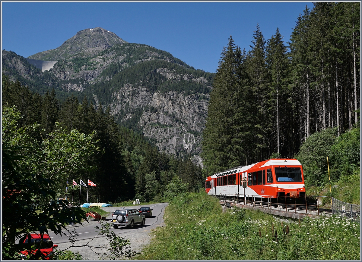 Der TMR Beh 4/8 N° 72 als Regionalzug 26222 von Martingy nach Vallorcine zwischen Châtelard und Vallorcine. Links oben im Bild ist Staumauer des Lac d'Emosson zu erkennen.