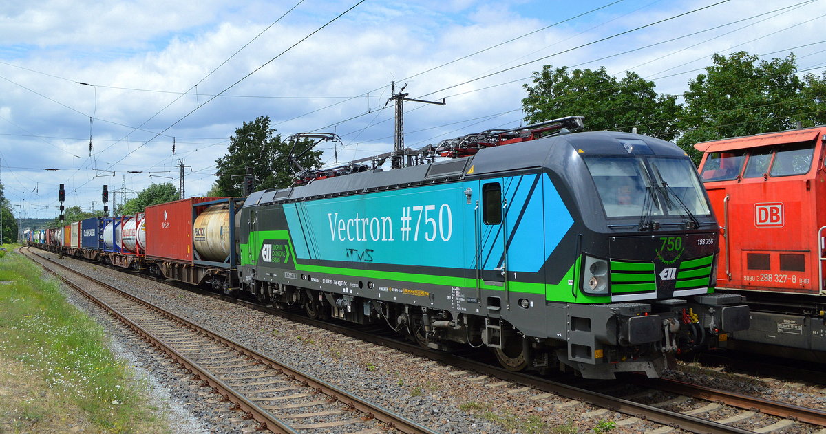 Die 750´tige Siemens Vectron MS von ELL ist für RTB CARGO GmbH, Düren [D] im Einsatz, die "193 756" [NVR-Nummber: 91 80 6193 756-4 D-ELOC], hier mit Containerzug am 07.07.20 im Bf. Saarmund zu sehen bei der Durchfahrt.