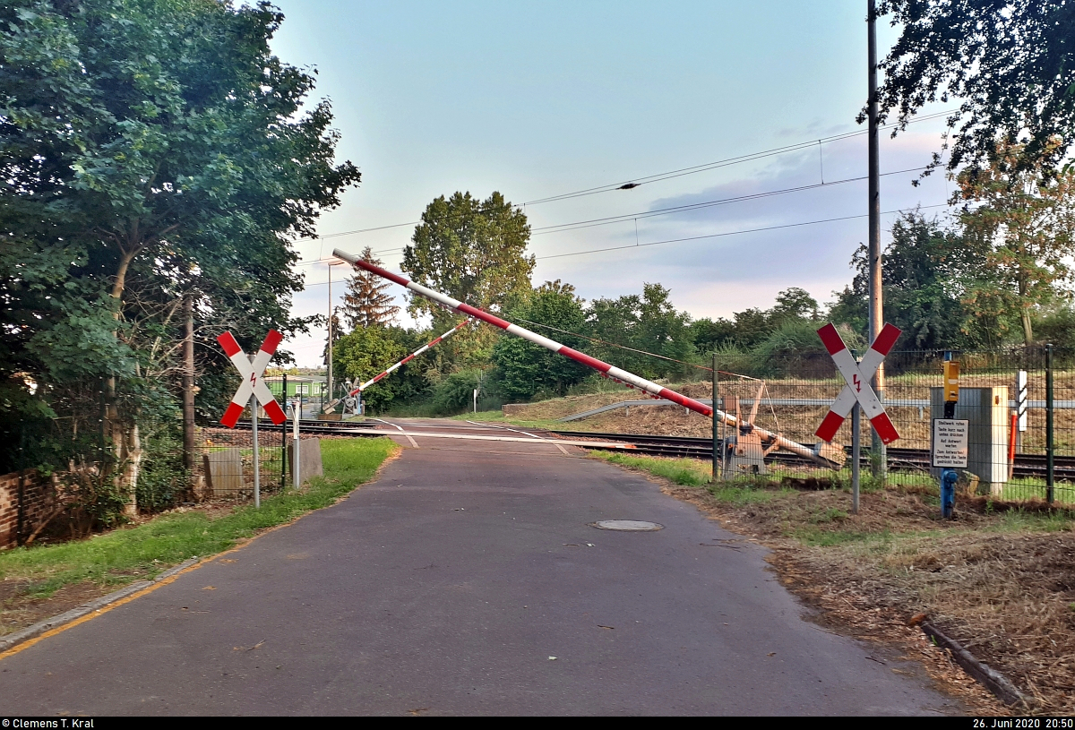 Blick auf die Anrufschranke in Zscherben, Angersdorfer Straße, an der Bahnstrecke Halle–Hann. Münden (KBS 590).