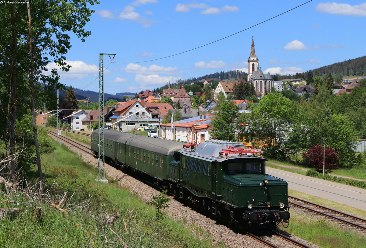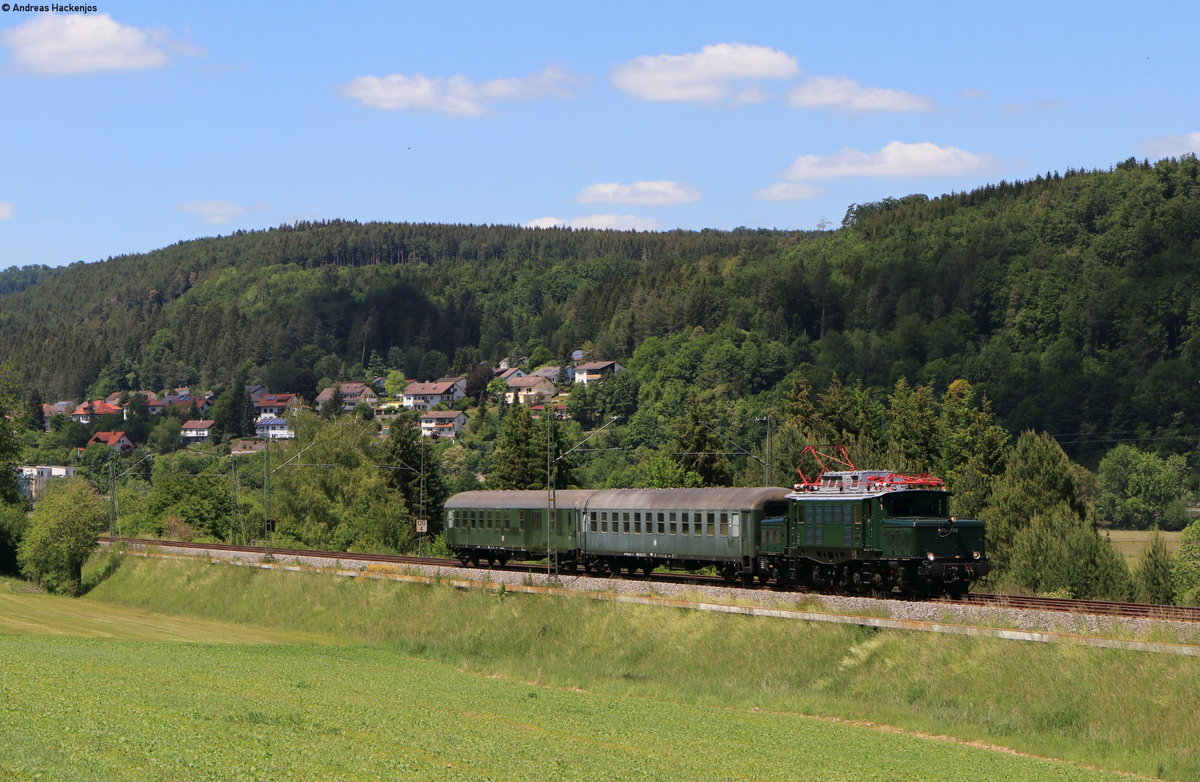 Ein Bild wie aus den 1970-ern: Während die chromdioxidgrüne 151 119 ihren Güterzug Richtung Treuchtlingen beschleunigt, knattert parallel ein VW 1302 die Straße von Felsheim nach Wörnitzstein hinauf. Wir befinden uns allerdings im Jahr 2020, der ehemalige Bundesbahn-Sechsachser hat eine neue Heimat bei der BayernBahn gefunden und bespannte am 01. Juni den DGS 59940 von Wassertrüdingen nach Langenfeld, besser bekannt als sogenannter Henkel-Zug. Mit der Leistung werden Produktionsmittel und Haarpflegeprodukte zwischen zwei Produktionsstandorten hin und her transportiert. Der Käfer wurde freundlicherweise als schmückendes Beiwerk zur Verfügung gestellt. Diverse Autofahrer, Radfahrer und Fußgänger wurden erfolgreich durch Rufen dazu motiviert, rechtzeitig den Bildausschnitt zu verlassen.