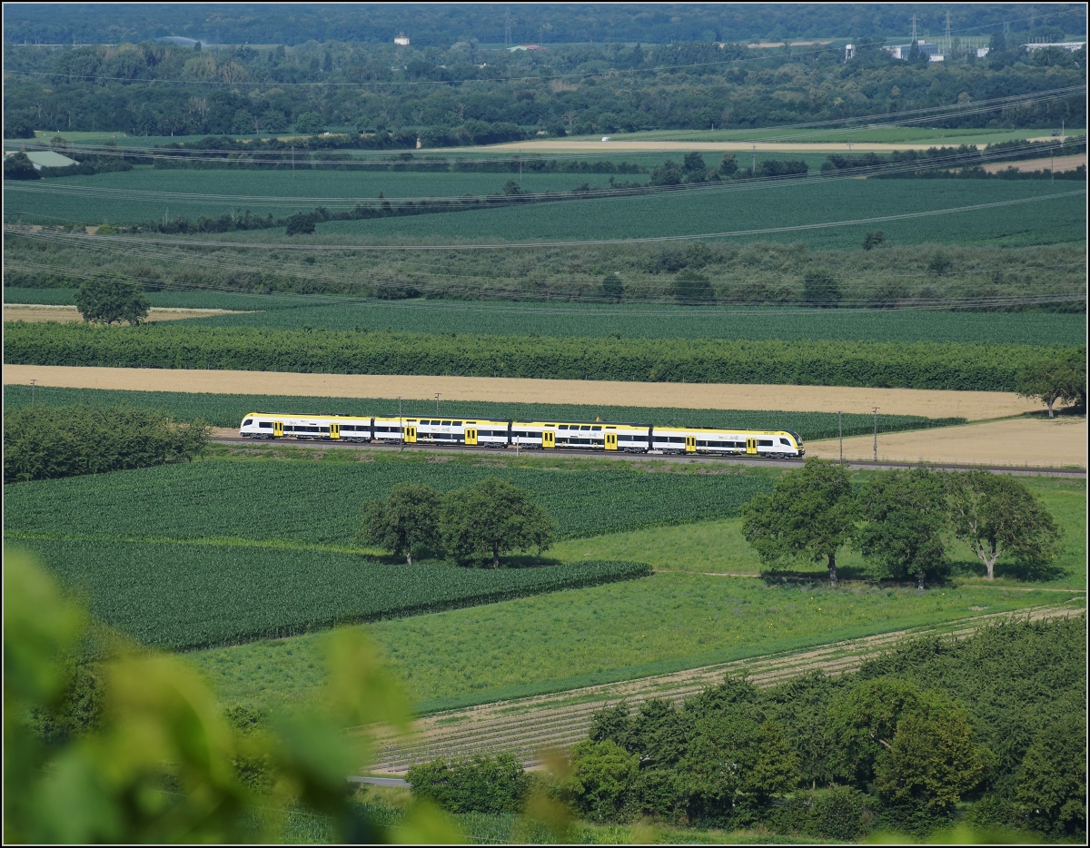 Ein neuer Anblick im Markgräflerland ist die BR 462. Aus den Auggener Weinbergen reicht der Blick bis zum Molkenrain und weiter links bis zum 60 km entfernten Elsässer Belchen. Der Industrieriegel befindet sich schon hinter der Grenze zu Frankreich. Juli 2020.