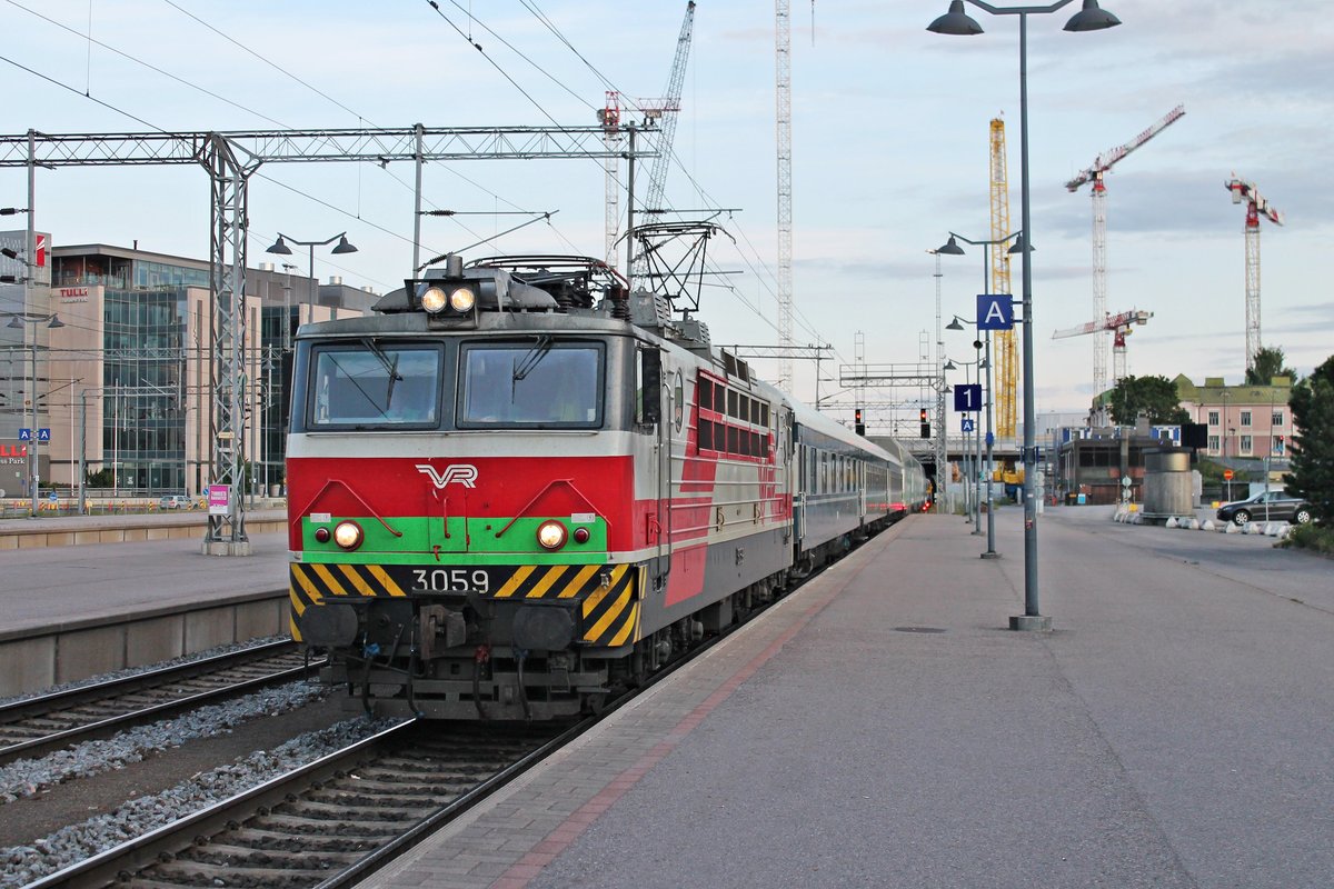 Einfahrt am Abend des 10.07.2019 von Sr1 3059 mit dem Nachtzug P 263 (Helsinki - Kolari) auf Gleis 1 in den Bahnhof von Tampere. Nachdem hier noch drei Autotransportwagen angehängt wurden, ging die Fahrt dann weiter in Richtung Norden.