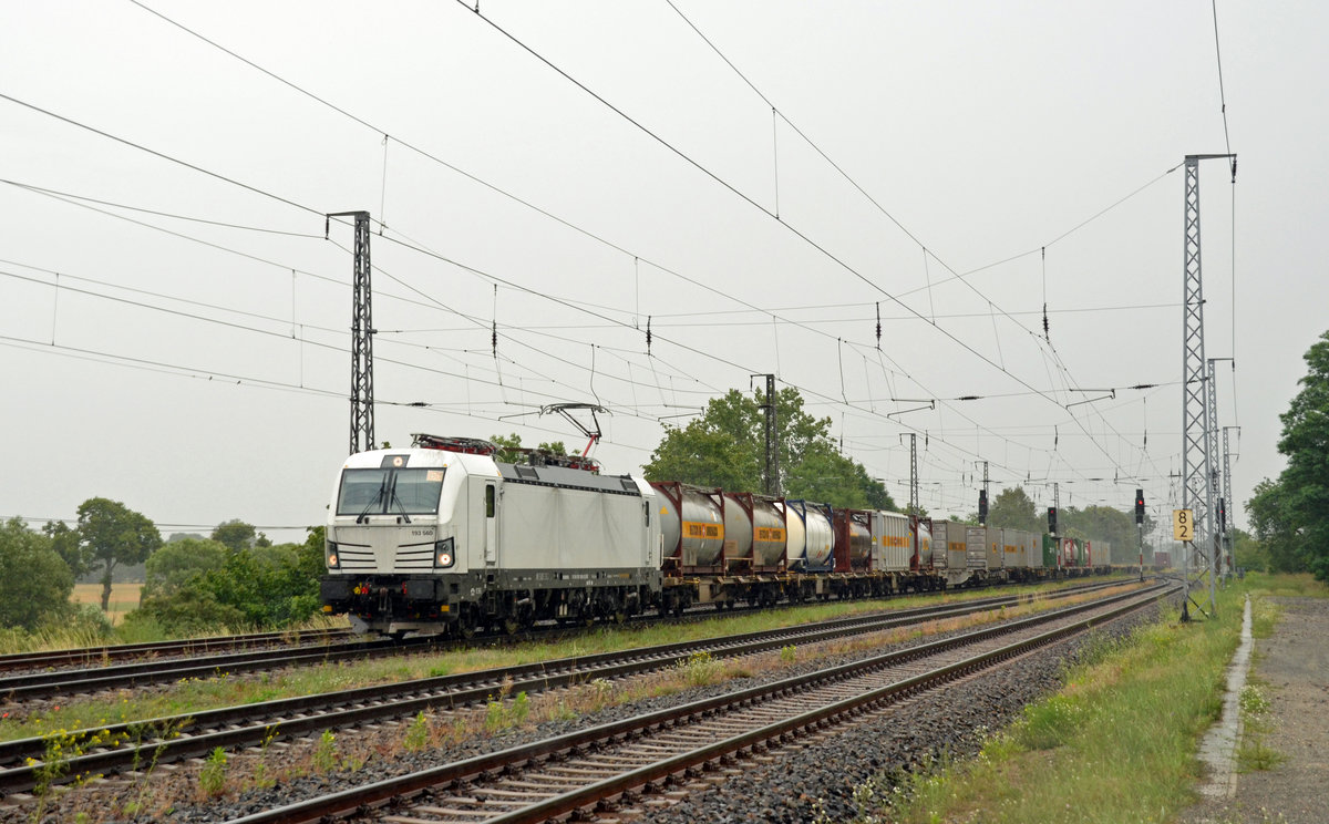Zuckerzug mit 185 592-3 der Beacon Rail Leasing Limited, vermietet an die LTE Logistik- und Transport-GmbH (LTE), durchfährt den Hp Zscherben auf der Bahnstrecke Halle–Hann. Münden (KBS 590) Richtung Teutschenthal.