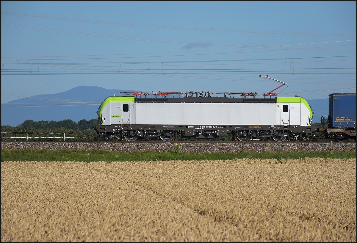 Noch ganz neu und ohne Alpinisten-Beklebung zieht die Re 475 416 aus der zweiten Bestellung der BLS am großen Belchen vorüber. Auggen, Juli 2020.