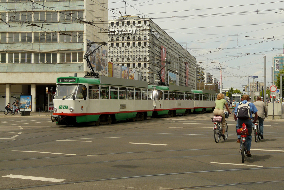 Schöner geht's kaum mit der Umweltfreundlichkeit: Kein Auto weit uns breit - Straßenbahn und Radfahrer bestimmen das Straßenbild an diesem 20. Juni 2008 auf der Fritz-Reuter-Allee in Magdeburg. Der Tatra-Zug wird von Tw 1264 angeführt.