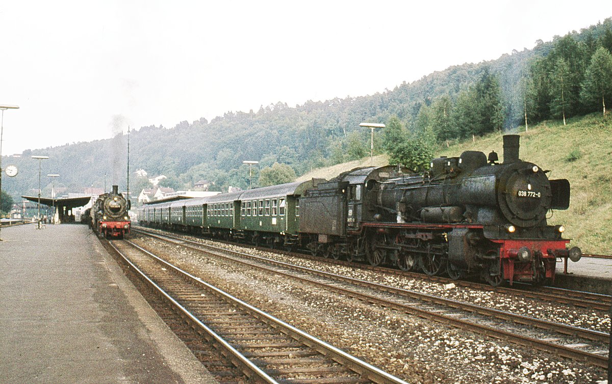 24. April 2010, Im Wiesenttal: Die Ulmer Eisenbahnfreunde veranstalteten eine Sonderfahrt mit ihrer 01 1066 von Wiesbaden über Schweinfurt nach Forchheim. Dort übernahm die Lok 4 (ELNA6) der DFS den Zug und führte ihn bis Behrigersmühle.