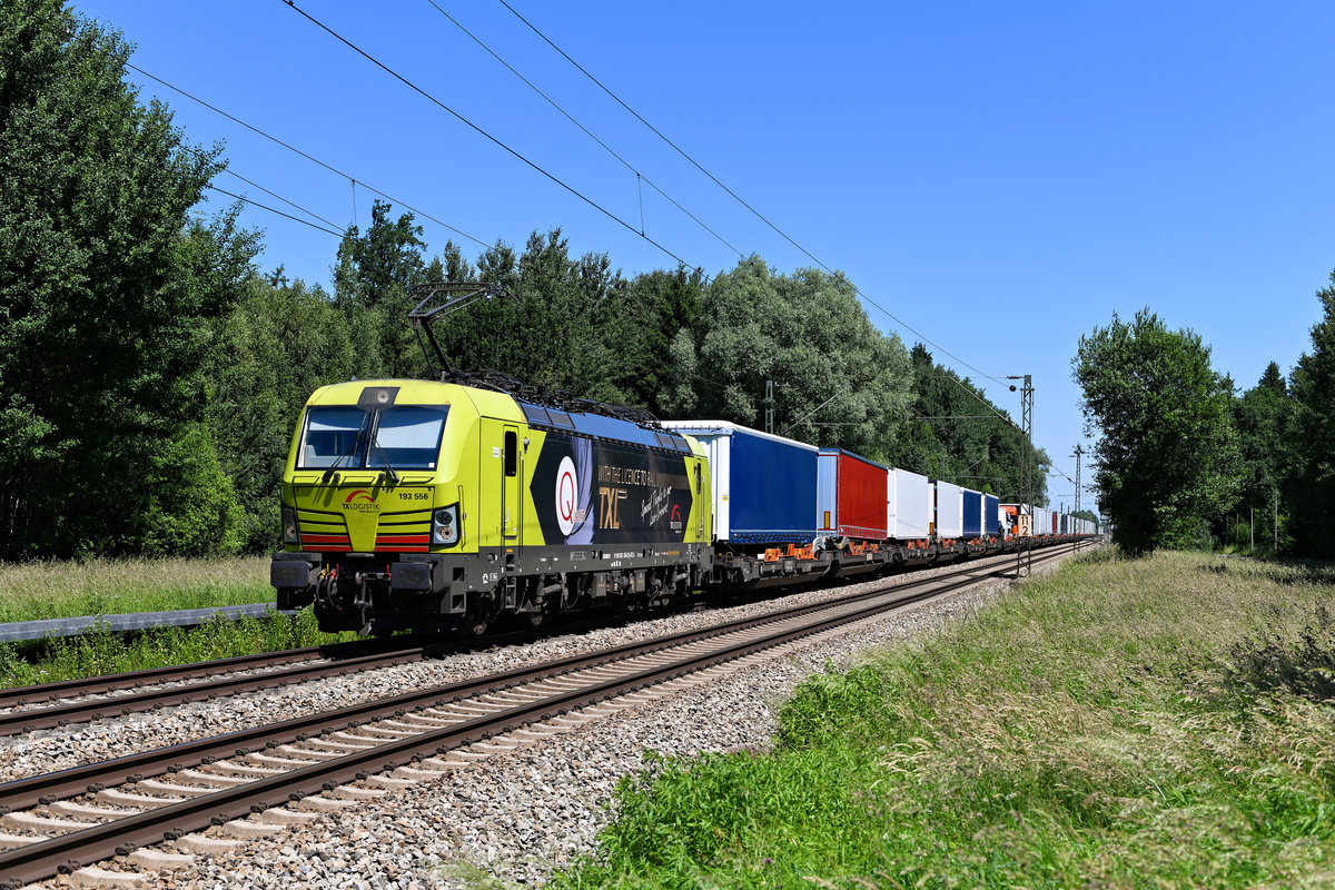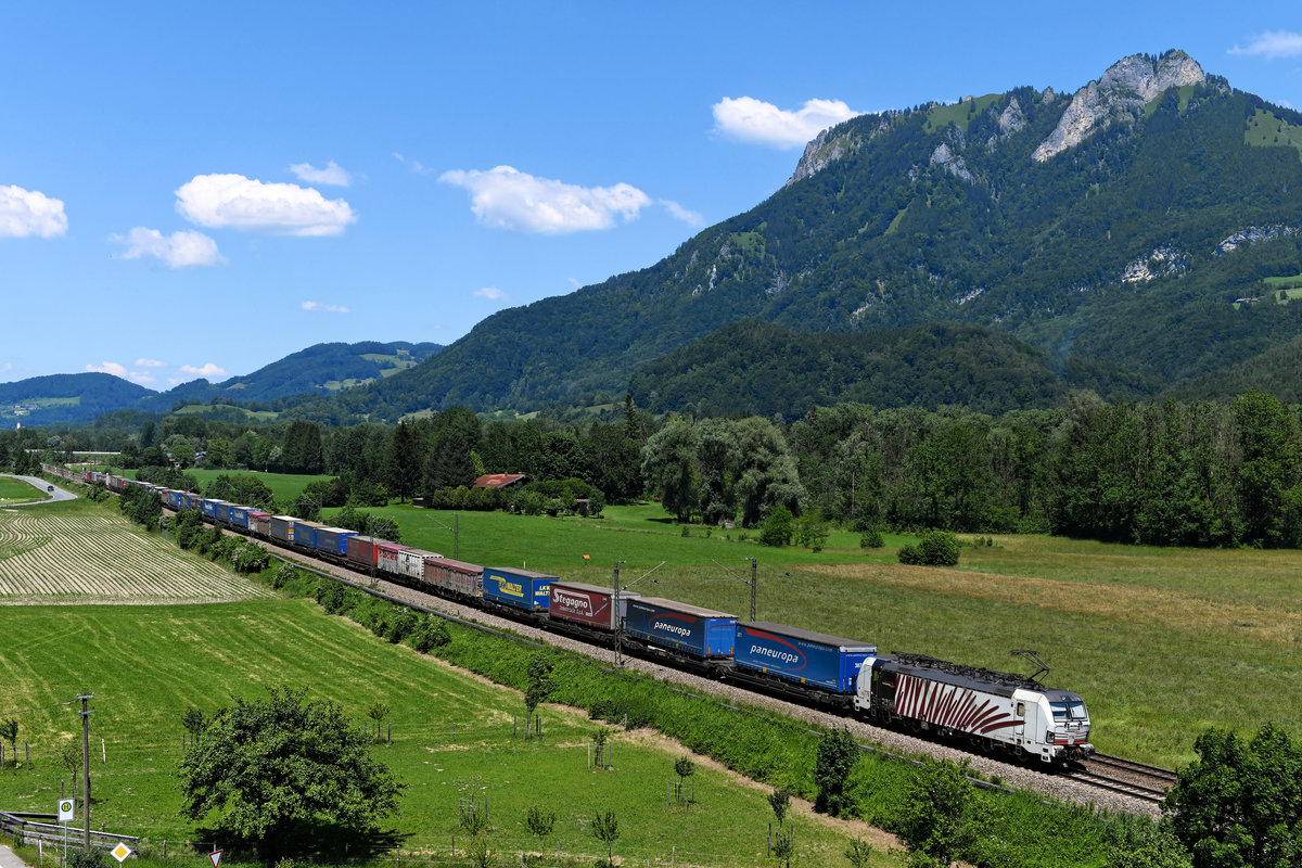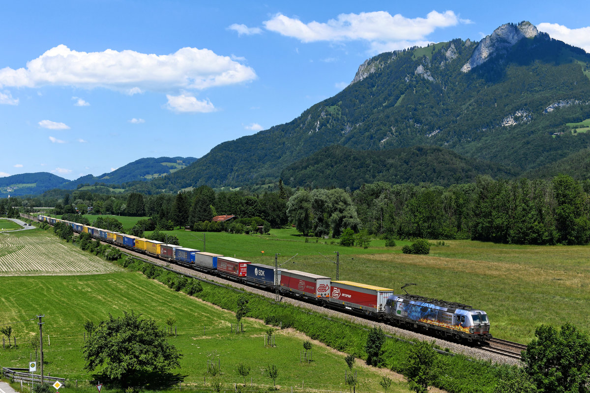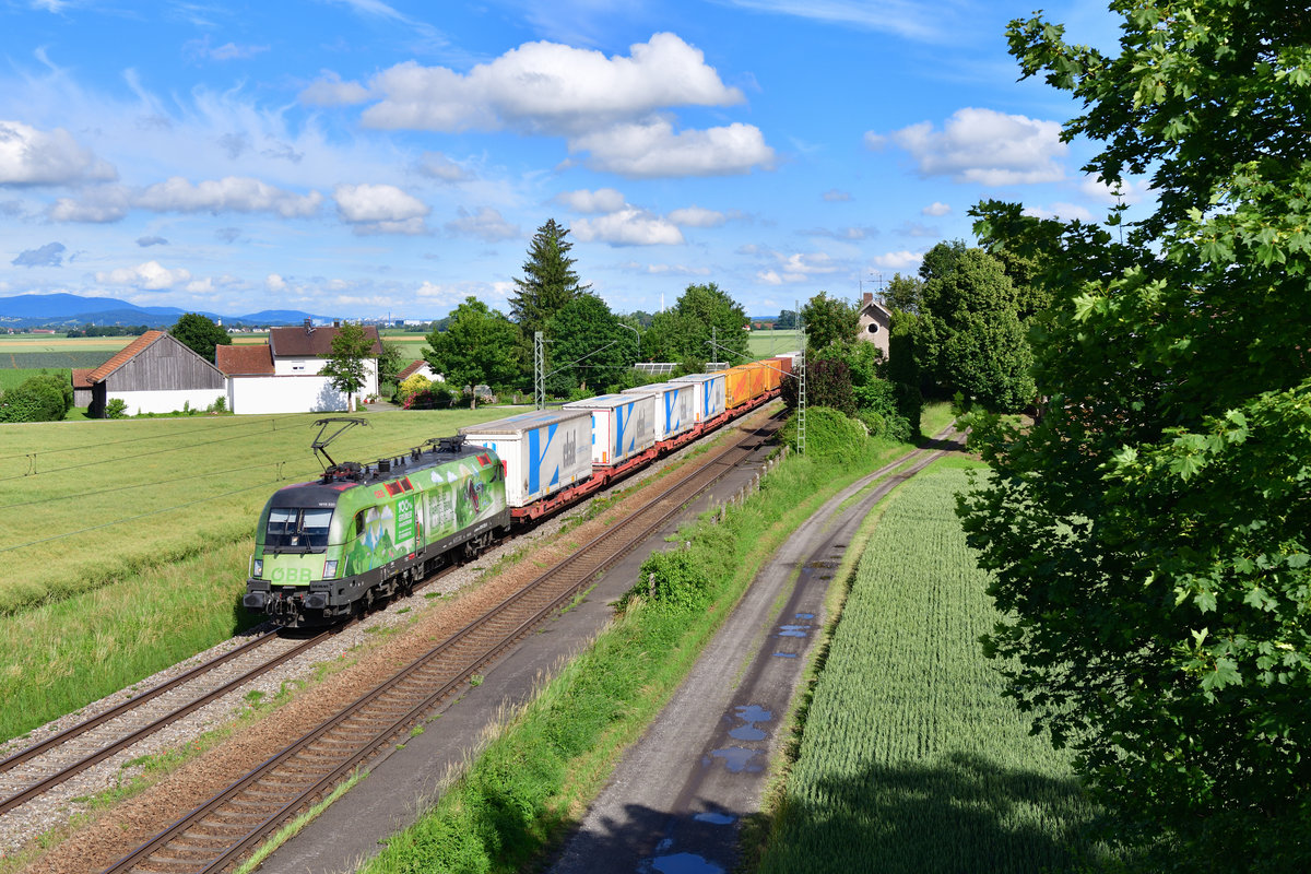 Immer wieder gern von mir aufgesucht wird der Blick über das Inntal und den Heuberg bei Kirnstein. Am 13. Juni 2020 konnte ich dort die 193 776 mit dem komplett beladenen DGS 43119 von München Ost Rbf nach Verona Q.E. fotografieren.