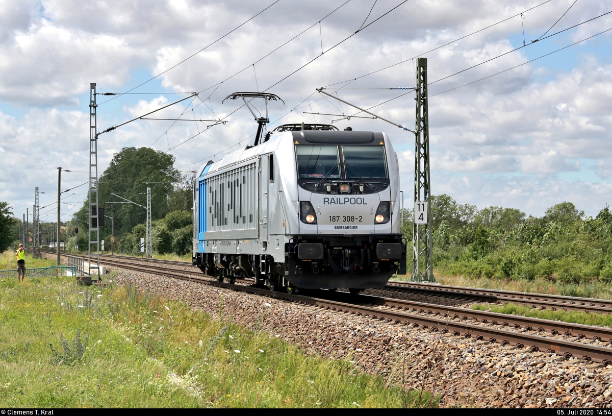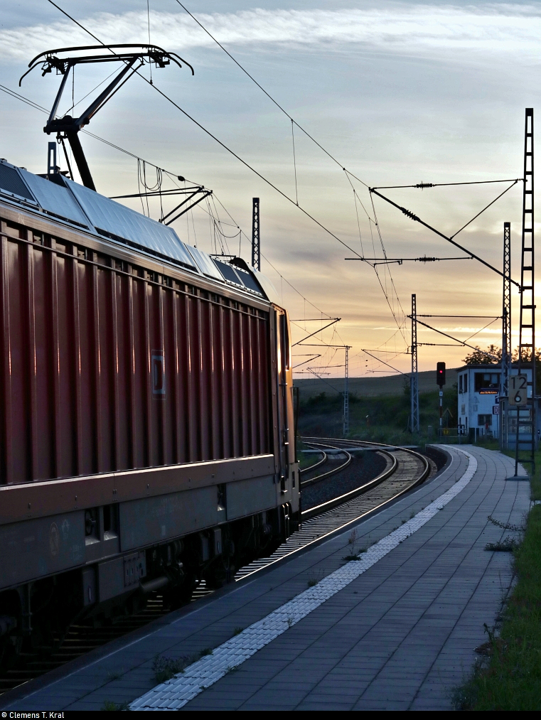 Warten auf die Weiterfahrt: Schon des Öfteren ist mir in letzter Zeit aufgefallen, dass Züge in Fahrtrichtung Teutschenthal an der Blockstelle Zscherben auf der Bahnstrecke Halle–Hann. Münden (KBS 590) ausgebremst werden - anscheinend nicht nur aufgrund zu dichter Zugfolge. Dieses Bild zeigt 187 126-8 DB, die vor dem Halt zeigenden Signal am Bahnsteig steht. Nach einem Telefonat des Tf und einigen Minuten des Wartens konnte sich der gemischte Gz durch ein Ersatzsignal wieder in Bewegung setzen. [3.7.2020 | 21:12 Uhr]