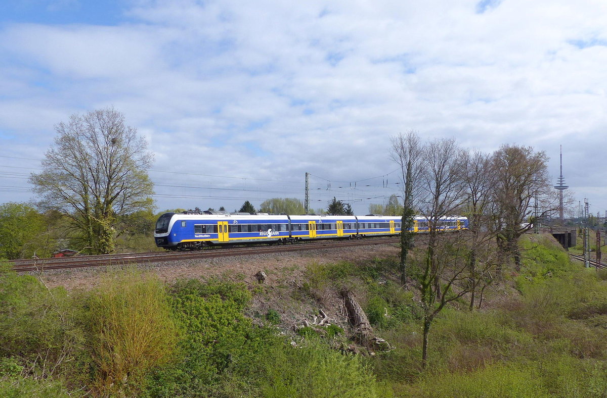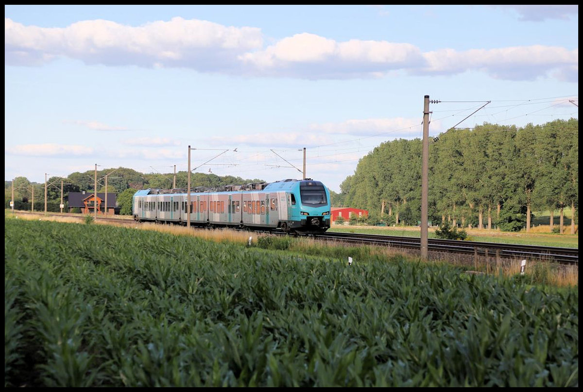 Am 12.07.2020 verkehrte die Eurobahn nur zwischen Osnabrück und Hengelo, da zwischen Osnabrück und Melle eingleisig gefahren wurde. Hier kommt ET 4.04 auf dem Weg nach Hengelo um 19.09 Uhr durch die Bauernschaft Tecklenburg Ledde.