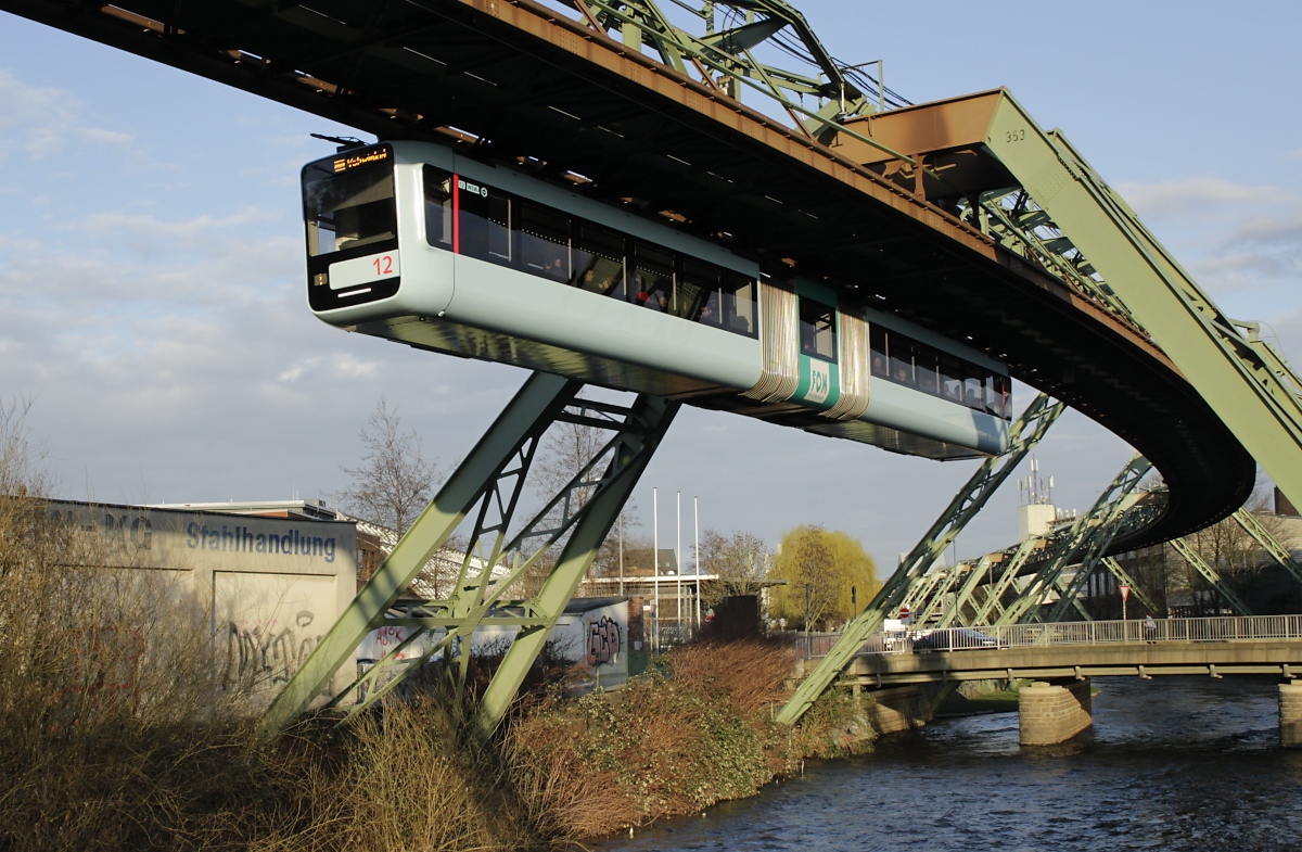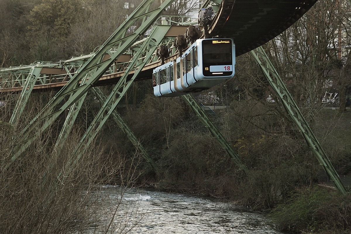 Auf der Fahrt von Oberbarmen nach Vohwinkel wurde der Wuppertaler Schwebebahnwagen 12 am 14.03.2020 unweit der Station Loher Brücke aufgenommen