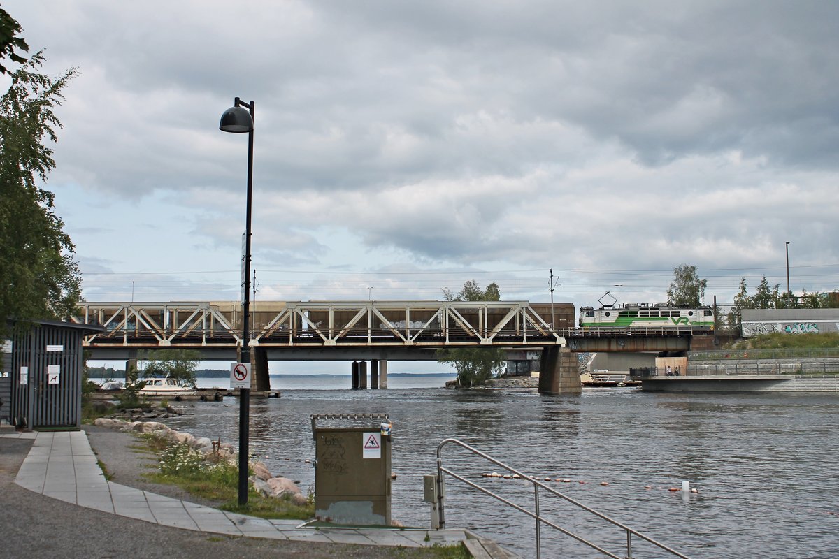 Am Nachmittag des 11.07.2019 fuhr Sr1 3053 mit einem Güterzug über eine Brücke in Tampere über den Näsiselkä-See in Richtung Hauptbahnhof.