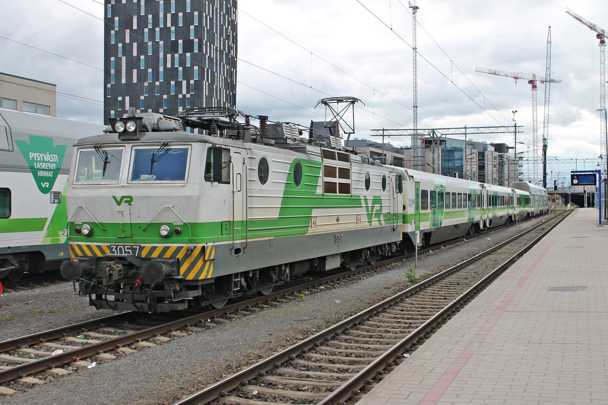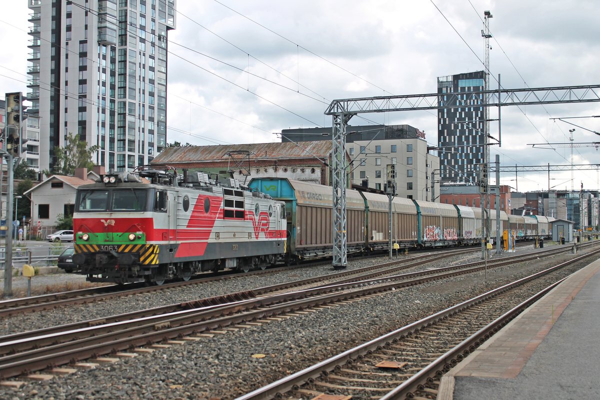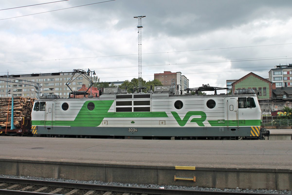 Portrait von Sr1 3034, als diese am Mittag des 11.07.2019 mit einem Holzzug durch den Bahnhof von Tampere in Richtung Güterbahnhof fuhr.
