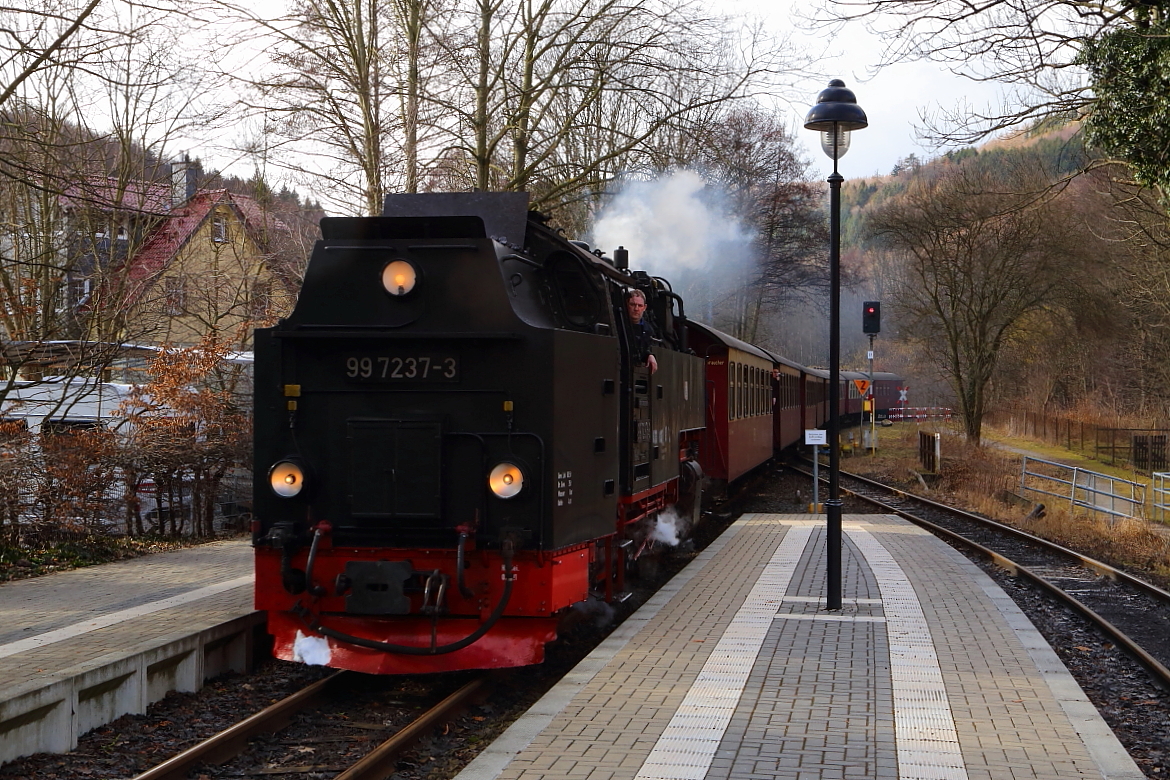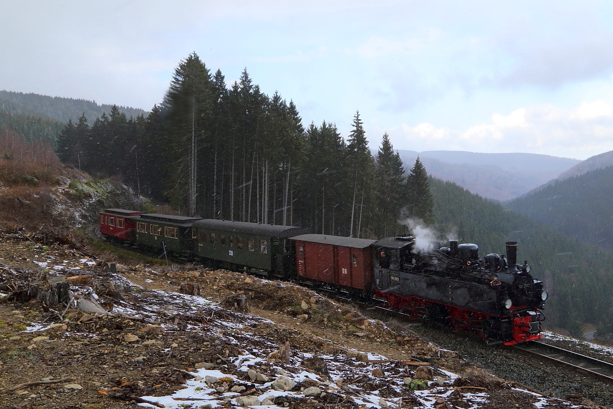 Im Haltepunkt Wernigerode-Hasserode erfolgte für unseren Sonderzug ein kurzer Zwangsaufenthalt, um 99 7237 mit P 8930 vom Brocken, kreuzen zu lassen, welche hier gerade einfährt. Dann geht es zügig weiter zum ersten Fotostopp am Drängetal.