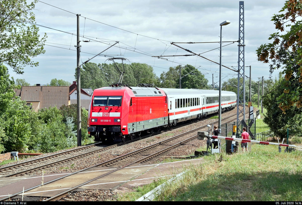 Mit gut 30 Minuten Verspätung passiert hier 101 006-5 mit Schublok 101 145-1 als IC 1956 von Leipzig Hbf nach Karlsruhe Hbf die Anrufschranke in Zscherben, Angersdorfer Straße, auf der Bahnstrecke Halle–Hann. Münden (KBS 590).