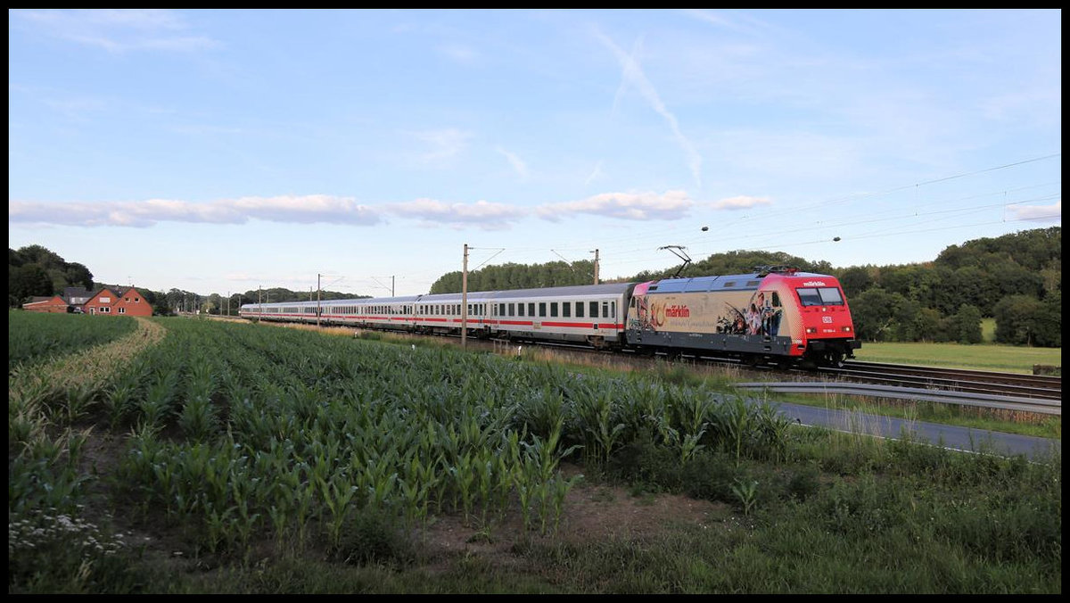 Aufgrund von Gleiserneuerungen zwischen Weimar und Apolda müssen die an Freitagen und Sonntagen verkehrenden IC der Linie 51 vom 1.6. bis 6.9.2020 weiträumig umgeleitet werden. Ganze 2 bis 2,5 Stunden ist man in diesem Zeitraum zwischen Erfurt Hbf und Leipzig Hbf unterwegs. Mit gut 30 Minuten Verspätung passiert hier 101 006-5 mit Schublok 101 145-1 als IC 1956 von Leipzig Hbf nach Karlsruhe Hbf die Anrufschranke in Zscherben, Angersdorfer Straße, auf der Bahnstrecke Halle–Hann. Münden (KBS 590). Rechtzeitig zur Durchfahrt zeigte sich auch kurz die Sonne. [5.7.2020 | 14:16 Uhr]