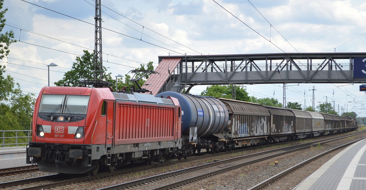 DB Cargo AG [D] mit  187 137  [NVR-Nummer: 91 80 6187 137-5 D-DB] und gemischtem Güterzug Richtung Seddin am 09.06.20 Bf. Saarmund.