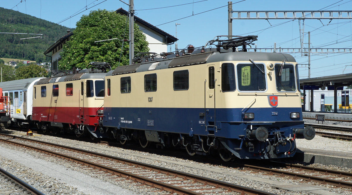 Noch am Sonntag den 12. Juli 2020 fotografierte ich den einzigen Werbetriebwagen der ASm Flotte Langenthal in Oensingen neben der IRSI Re 421 387-2 im besten Licht.