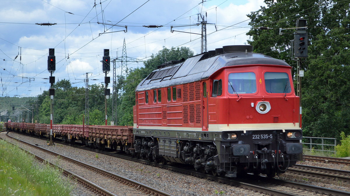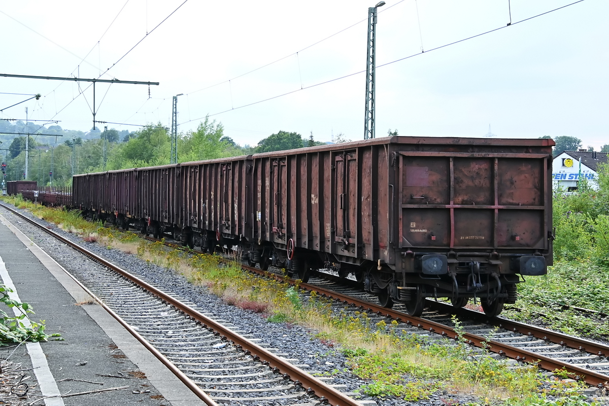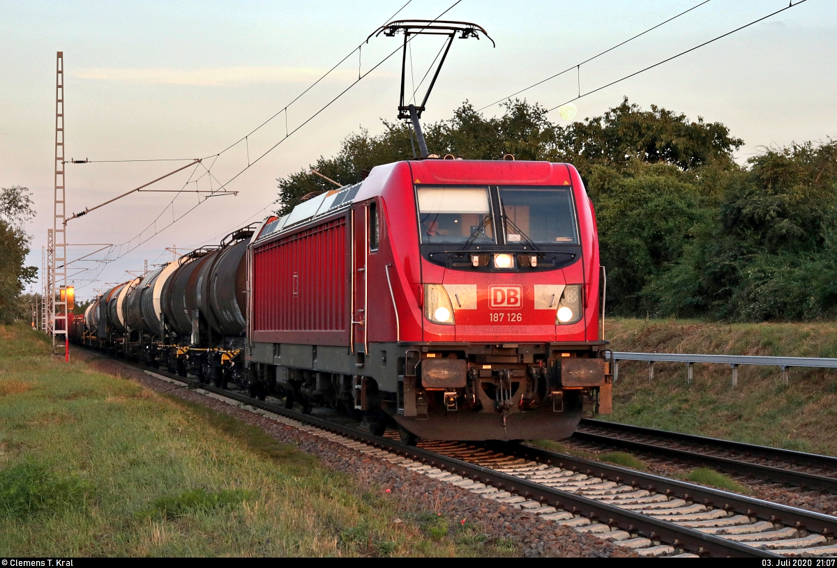 In Schrittgeschwindigkeit nähert sich ein gemischter Gz mit 187 126-8 DB einem Halt zeigenden Signal im Hp Zscherben auf der Bahnstrecke Halle–Hann. Münden (KBS 590), Fahrtrichtung Teutschenthal. Bereits etwa 2,5 Stunden zuvor wurde die Lok bei Eisdorf (Teutschenthal) aus der Gegenrichtung gesichtet. [3.7.2020 | 21:07 Uhr]