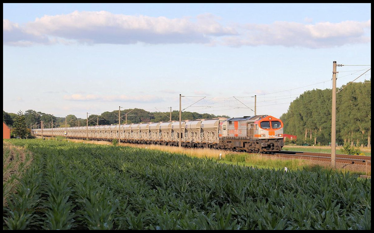 HVLE Tiger V 300-7 hat hier am 12.07.2020 um 19.51 Uhr bei Tecklenburg Ledde einen langen Schotterzug am Haken, den sie von Grohnde zum Bahnhof in Ibbenbüren Esch bringt.