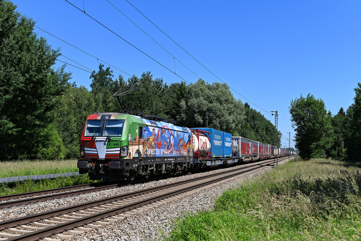Im Waldstück zwischen Reischenhart und Brannenburg konnte ma 13. Juni 2020 der DGS 43101 von Wanne-Eickel nach Verona Q.E., der erfreulicherweise von der bunten 193 640 bespannt wurde, fotografiert werden.