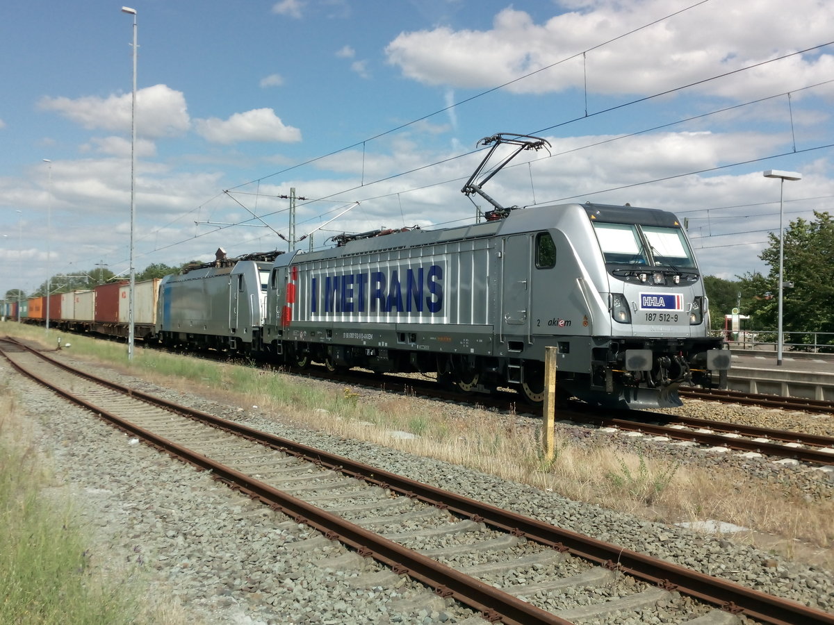 Metrans Mietlok 187 512 mit defekter 186 429 im Schlepp am 30.06.2020 in Burg b. Mg auf dem Weg von Decin nach Hamburg .