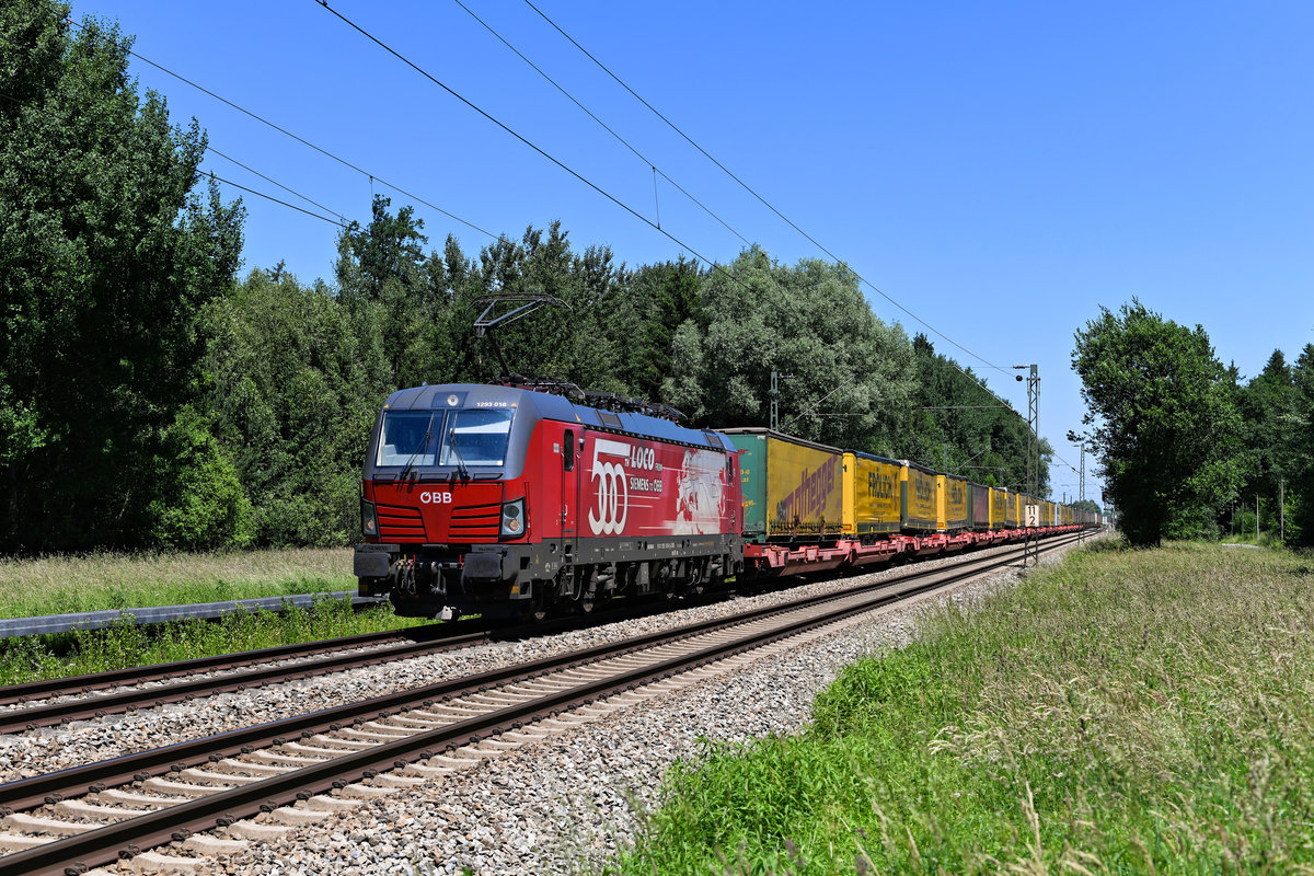 Normalerweise ist die 1293.018, die mit ihrer Beschriftung darauf hinweist, dass sie die 500. Lok ist, die von Siemens an die ÖBB ausgeliefert wurde, oft monatelang in Italien oder Slowenien im Einsatz. Im Juni diesen Jahres pendelte sie allerdings mehrfach vor KLV-Zügen zwischen Norditalien und Deutschland hin und her. Am 13. Juni 2020 war der Vectron vor dem DGS 42171 von Kassel nach Verona Q.E. im Einsatz, der praktisch ausschließlich von den Speditionen nothegger und Frölich genutzt wird. Im Waldstück zwischen Reischenhart und Brannenburg konnte ich die Leistung fotografieren.