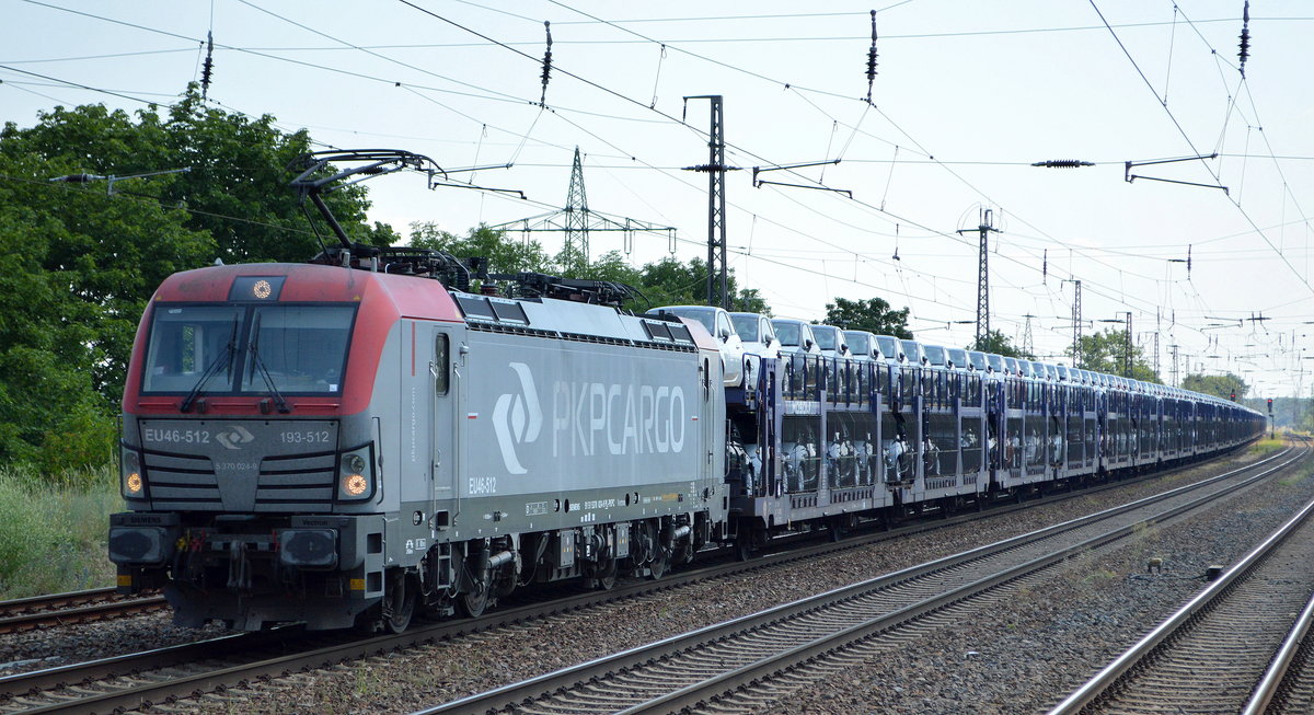 PKP CARGO S.A., Warszawa [PL] mit "EU46-512" [NVR-Nummer: 91 51 5370 024-9 PL-PKPC] und PKW-Transportzug (FIAT 500 aus polnischer Produktion) am 27.06.20 Bf. Saarmund.