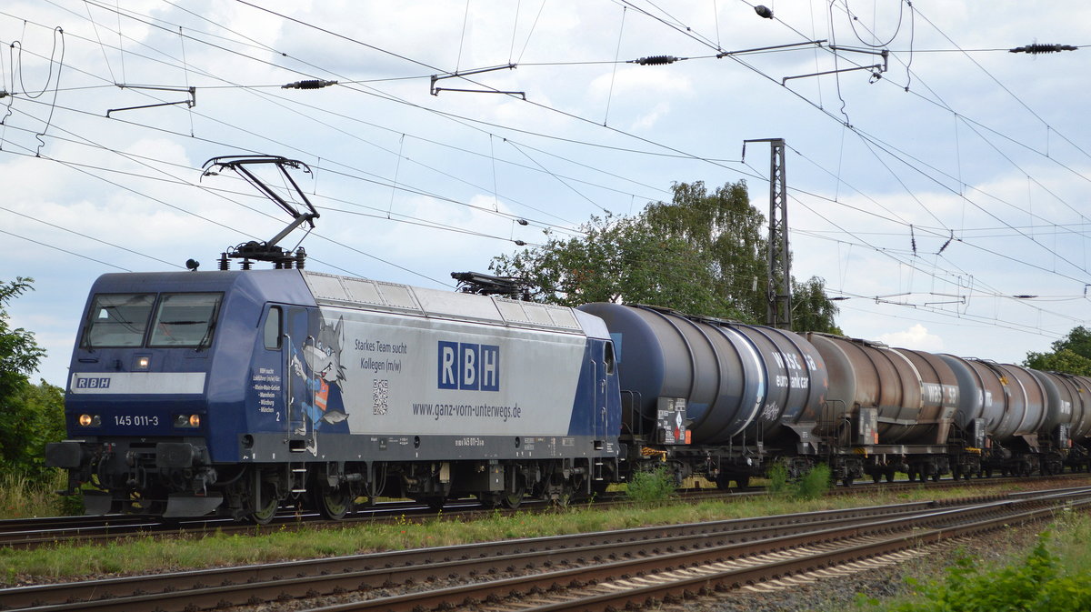 RBH Logistics GmbH, Gladbeck [D] mit  145 011-3   [NVR-Nummer: 91 80 6145 011-3 D-DB] und Kesselwagenzug am 03.07.20 Nähe Bf. Saarmund.