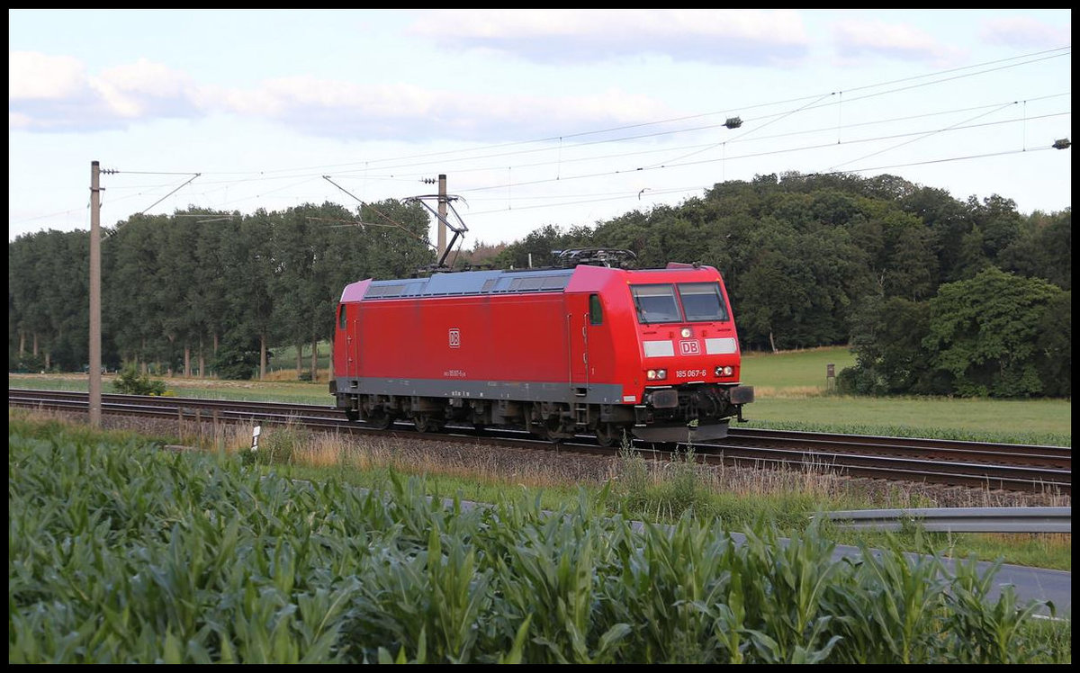 Containerzug (Löblein Transport GmbH) mit 185 003-1 DB durchfährt langsam den Hp Zscherben auf der Bahnstrecke Halle–Hann. Münden (KBS 590) Richtung Teutschenthal. Etwa vier Stunden zuvor wurde die Lok hier bereits aus der Gegenrichtung gesichtet. [3.7.2020 | 20:57 Uhr]