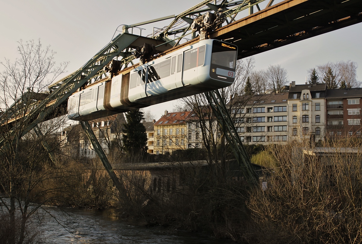 Über der Wupper ist der Wuppertaler Schwebebahnwagen 03 am 14.03.2020 von Vohwinkel nach Oberbarmen unweit der Station Loher Brücke unterwegs. Allerdings werden die Fahrzeuge nach den Sommerferien in NRW nur noch an Wochenenden verkehren. Grund sind technische Probleme an den neuen Triebwagen (hoher Verschleiß der Radreifen und fehlerhafte Klebestellen an Dächern und Aufbauten). Montags bis Freitags müssen die Wuppertaler voraussichtlich für ein Jahr auf Busse umsteigen.