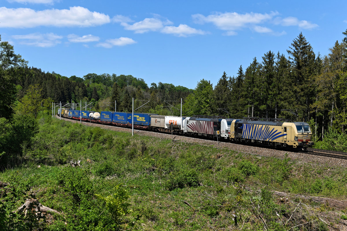 Mit einem fast artrein aus blauen Kesselwagen der RTIWagon bestehenden Ganzzug konnte die 193 828 von Retrack am 26. April 2020 bei Nordheim beobachtet werden. Die Leistung wurde über Salzburg und München umgeleitet, da an der Passauer Bahn gebaut wurde.