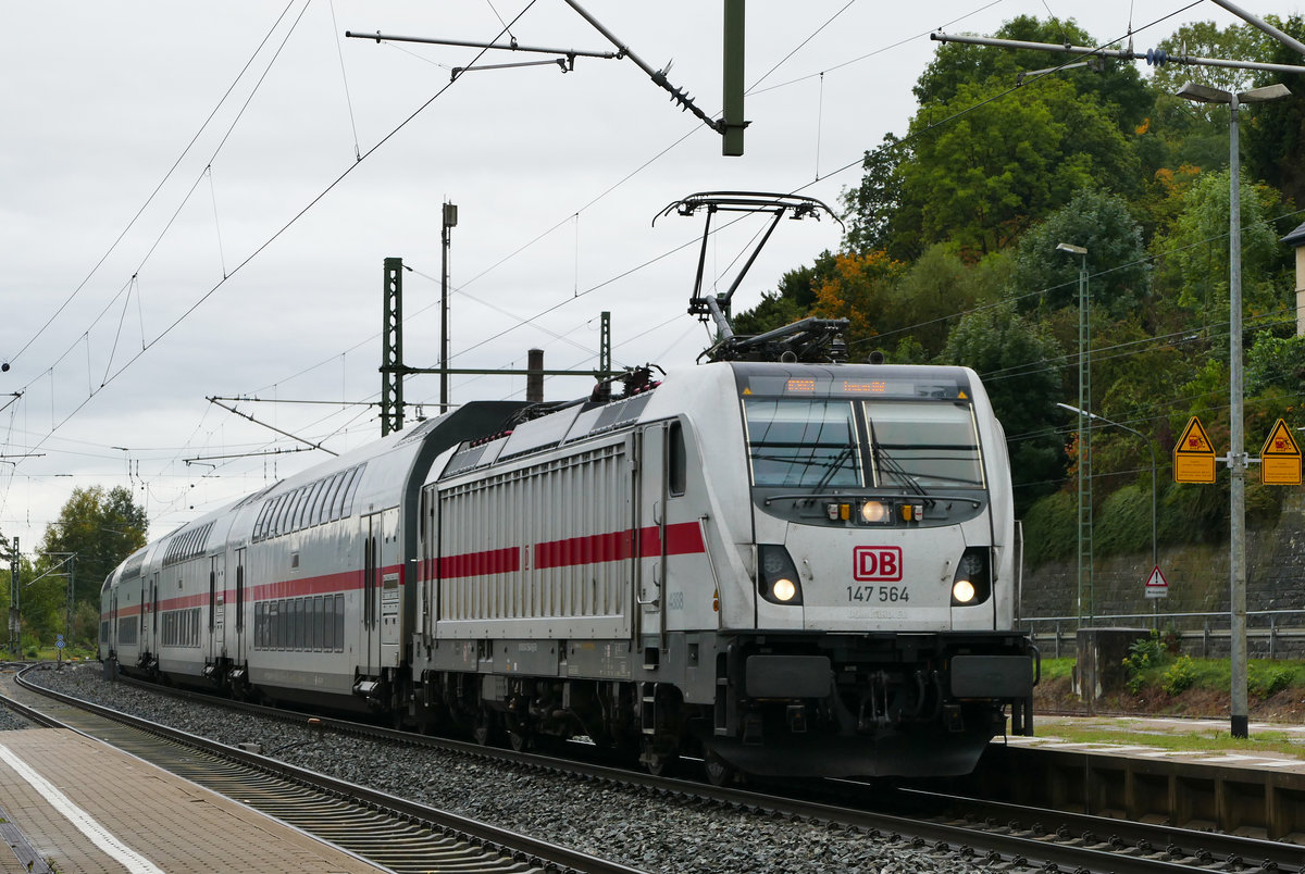 24. September 2019, IC 2063 fährt (natürlich stark verspätet) durch Oberlangenstadt in Richtung Kronach. Dienst hat Lok 147 565 mit Zuggarnitur 4889.