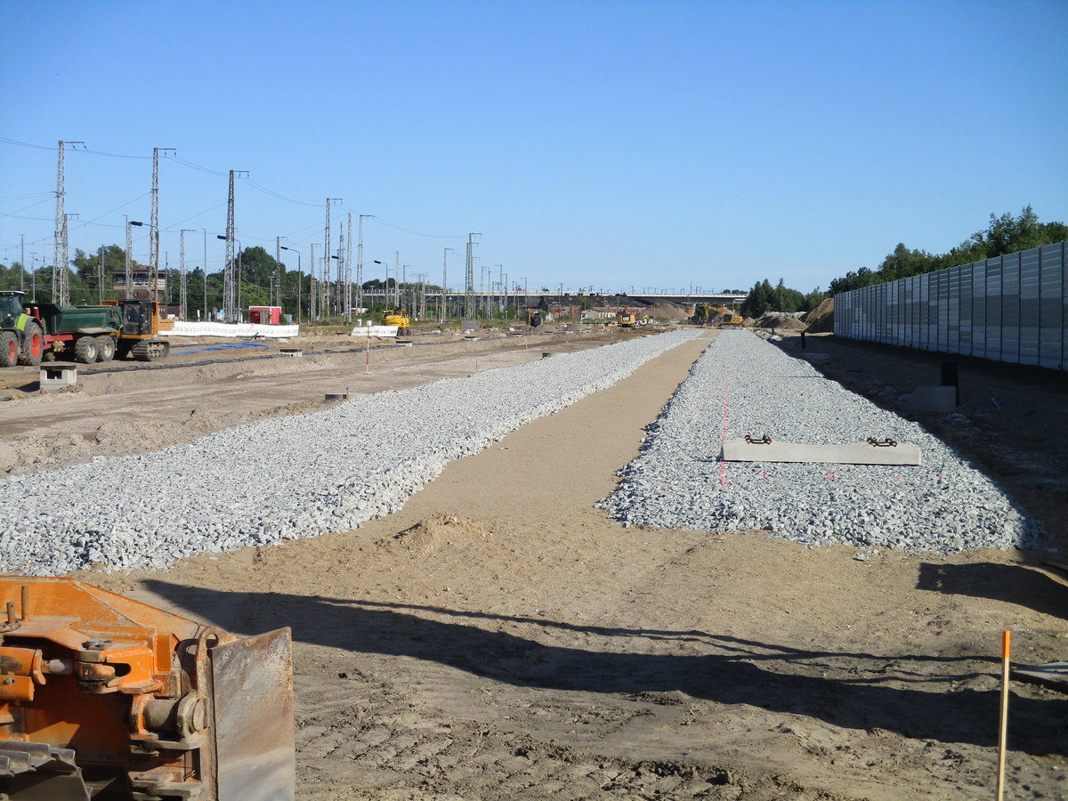 Diesen Blick hat man vom zukünftigen Ende der Abstellgleise aus in Stralsund.Die ersten Betonschwellen liegen auch schon,so das bald auch die ersten Gleise liegen werden.Aufgenommen am 15.Juni 2020.