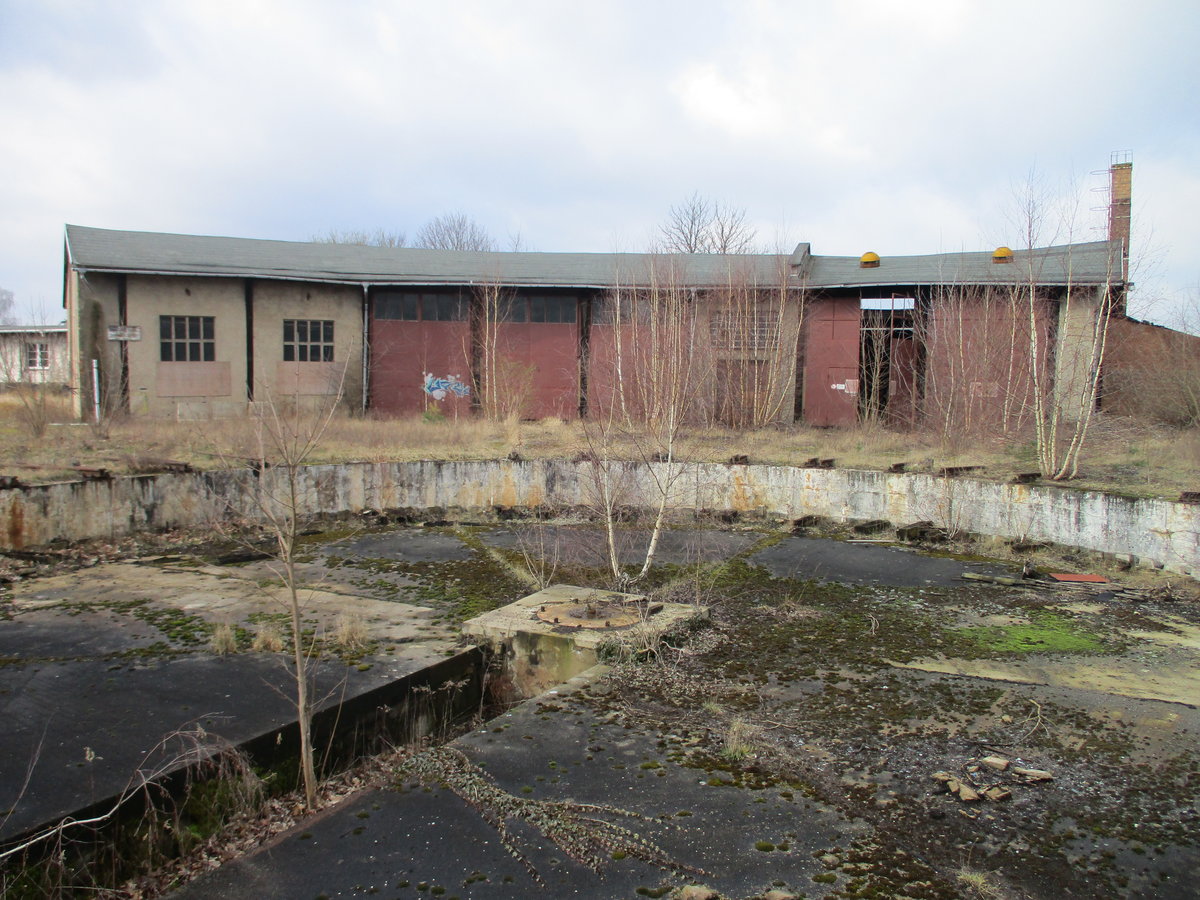 Der ehemalige Lokschuppen von der Est Parchim am 22.Februar 2020.Gut zuerkennen ist noch die ehemalige Drehscheibengrube.Aufgenommen durch den Zaun.
