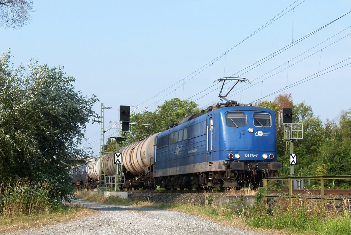 12. August 2015, Ein Kesselwagenzug mit Lok 151 118 der Eisenbahngesellschaft Potsdam mbH fährt bei Johannisthal in Richtung Saalfeld.