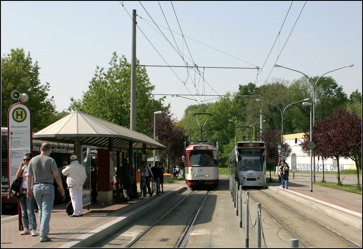 Mit der Straßenbahn nach Freiburg-Landwasser - Die Endhaltestelle Moosweiher am nördlichen Ende der Trabantenstadt Landwasser. Hier kann von den Bussen direkt in die Straßenbahn umgestiegen werden. 11.05.2011 (M)