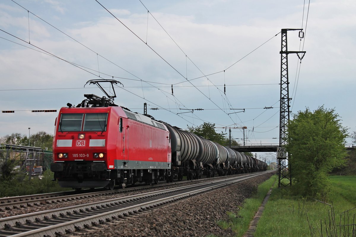 Am Nachmittag des 25.04.2019 fuhr 185 103-9 mit einem leeren Kesselzug (Basel SBB RB - Antwerpen Noord), welchen sie bis Aachen West bespannte, südlich vom Haltepunkt Auggen über die KBS 703 durchs Rheintal in Richtung Freiburg (Breisgau).