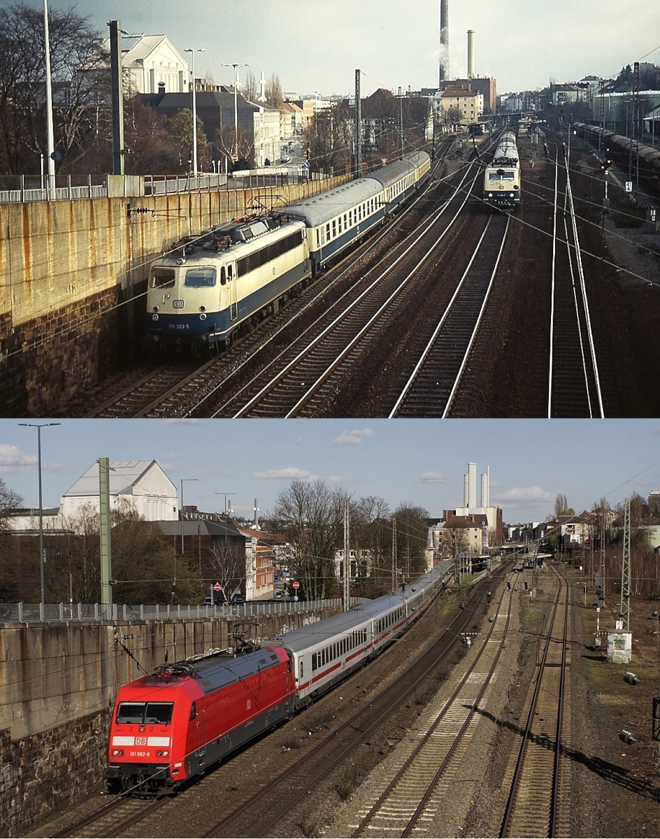 Sieht man einmal von den Zügen ab, hat sich an dieser Fotostelle in Wuppertal-Barmen in den letzten mehr als 30 Jahren nicht viel geändert. Oben fährt 110 333-2 mit einem kurzen Eilzug in der zweiten Hälfte der 1980er Jahre durchs Bild, unten ist der National-Express-ET 374 mit dem RE 7 von Rheine nach Krefeld am 12.03.2020 unterwegs. Und mir ist wiederum nicht gelungen, Bahn und Schwebebahn zusammen aufs Bild zu bekommen...