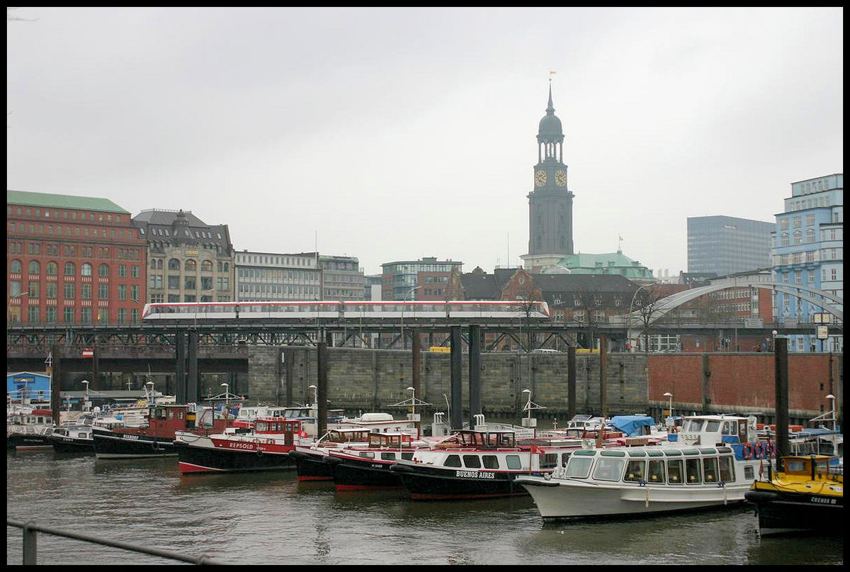 Nahe dem U-Bahnhof Baumwall ist hier am 9.3.2007 ein moderner U-Bahn Zug vor dem bekannten Michel in Hamburg unterwegs.