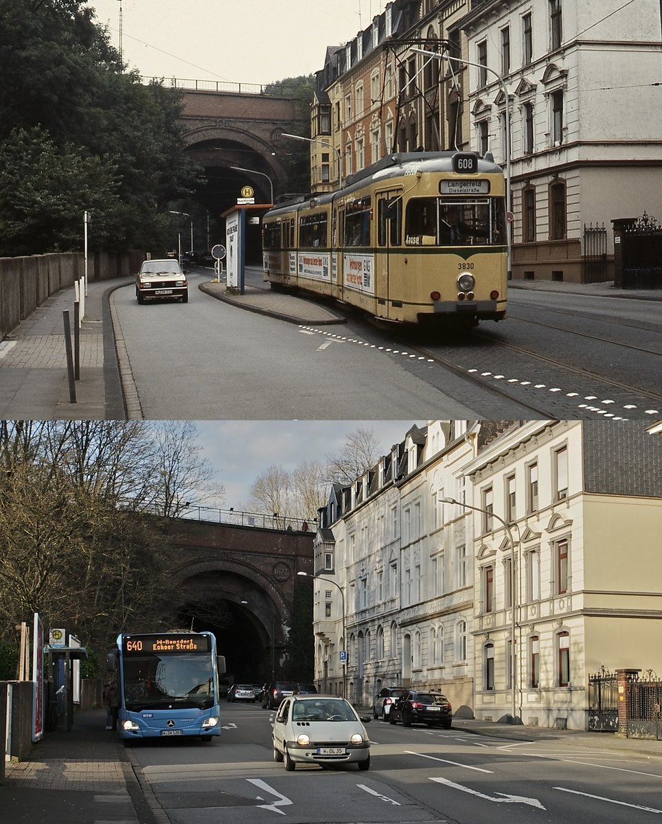 Spurensuche bei der Wuppertaler Straßenbahn: Um 1984 verläßt der WSW-Triebwagen 3830 als Linie 608 die Haltestelle Rudolfstraße auf der Schönebecker Straße, im Hintergrund der Viadukt der 1877 eröffneten Wuppertaler Nordbahn von Vohwinkel nach Wichlinghausen, die inzwischen als Radweg genutzt wird. Auf dem unteren Bild trifft am 14.03.2020 ein Bus der Linie 640 an der gleichen Haltestelle ein.