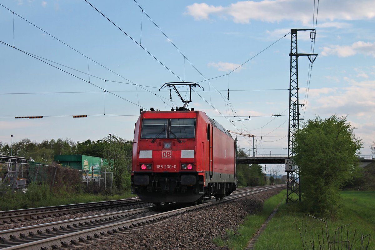Nachschuss auf 185 230-0, als diese am Nachmittag des 25.04.2019 als Lokzug (Müllheim (Baden) - Basel Bad Bf) südlich vom Haltepunkt von Auggen über die KBS 703 durchs Rheintal in Richtung Schweizer Grenze fuhr. Zuvor brachte sie einen Schotterzug nach Müllheim (Baden).