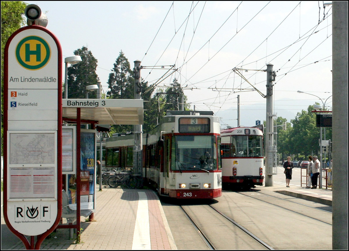 Die Haltestelle 'Lindenwäldle' am Südrand von Weingarten, halten heute auch die Bahnen der Strecke Innenstadt - Haslach - Rieselfeld. Vor und nach der Haltestellen verzweigen sich die Strecken.