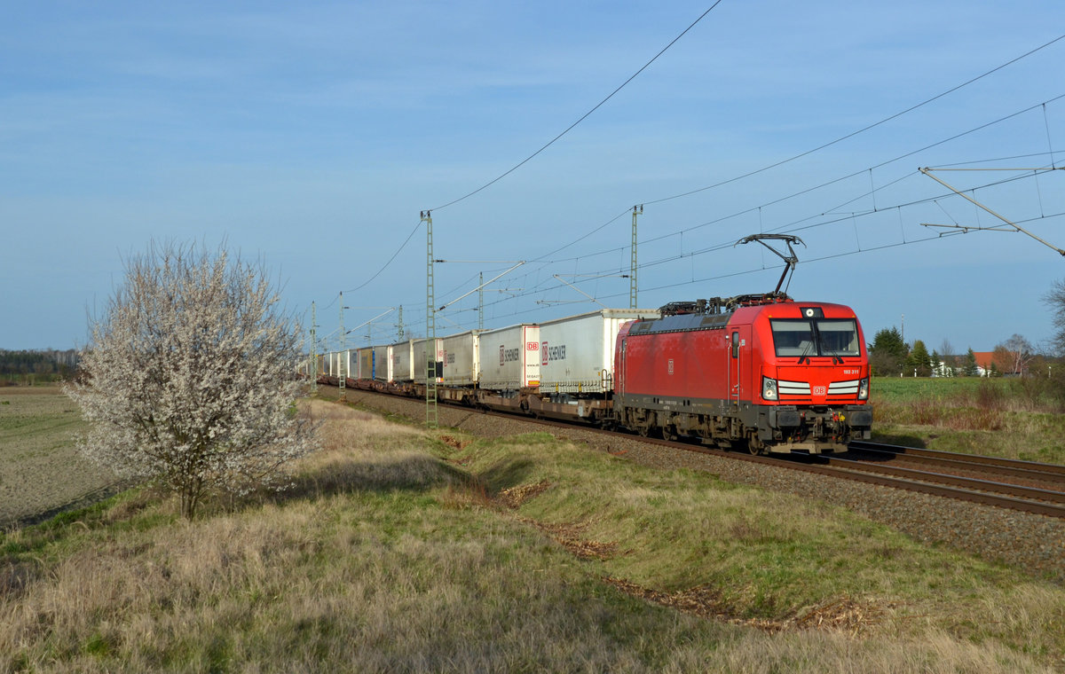 193 311 schleppte am 15.03.20 einen Schenker-KLV durch Gräfenhainichen Richtung Bitterfeld.