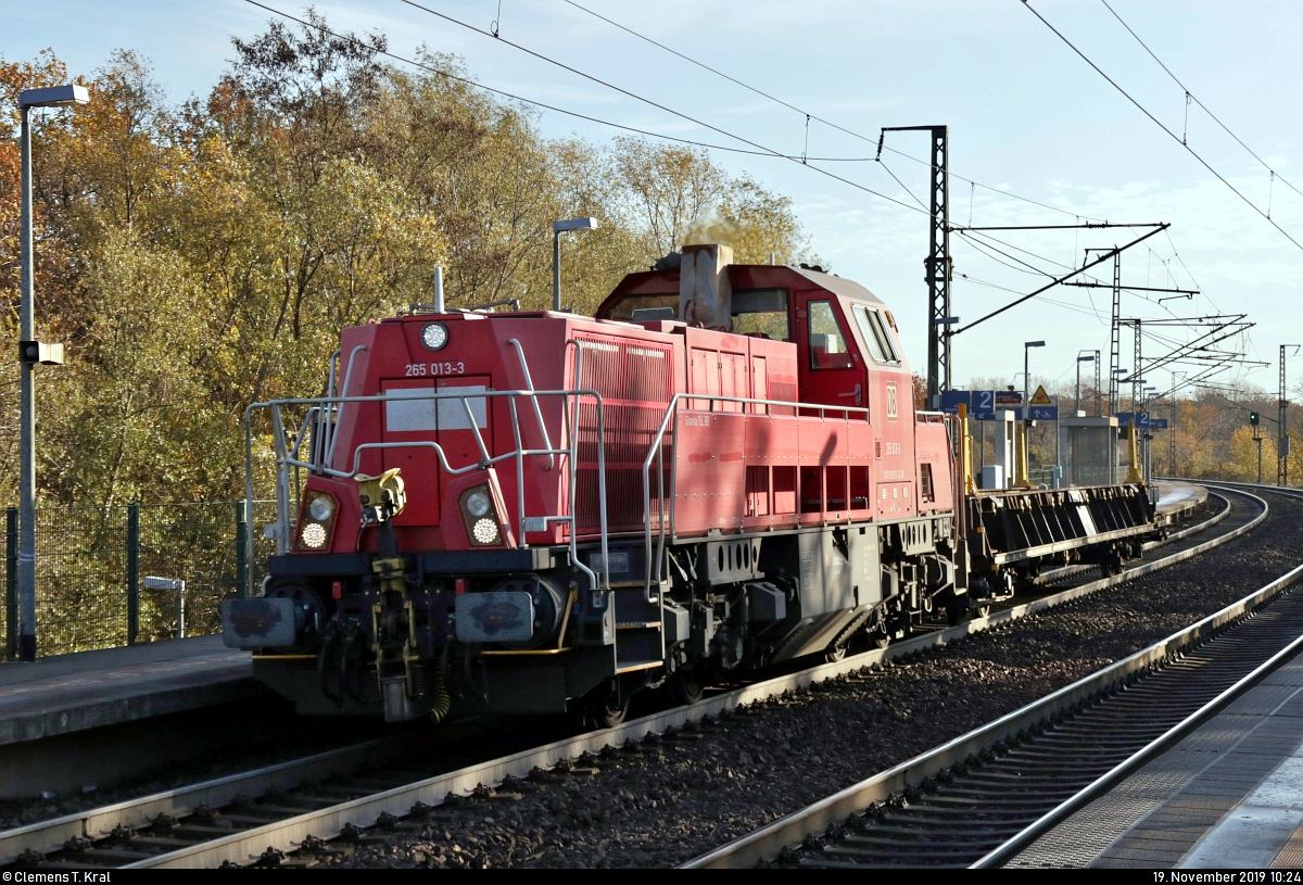 265 013-3 (Voith Gravita 15L BB) DB durchfährt mit einem Rungenwagen den Hp Magdeburg Herrenkrug auf der Bahnstrecke Berlin–Magdeburg (KBS 201) Richtung Magdeburg-Neustadt. [19.11.2019 | 10:24 Uhr]