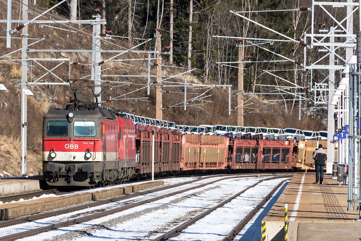 1144 245 und die BR 1116 unterwegs mit Autoganzzug bergwärts in Richtung Semmering. Breitenstein, am 08.02.2020.