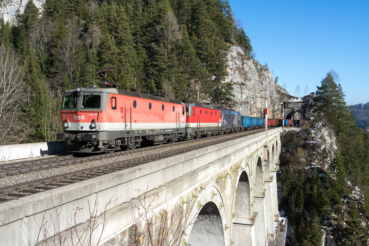 1144 252 einer Dreifachbespannung war an der Spitze dieses Güterzuges über den Semmering anzutreffen. Breitenstein, Krauselklause-Viadukt am 08.02.2020.