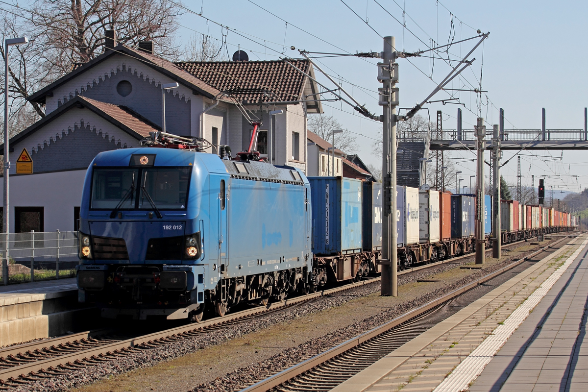 Am 06.05.2019 bespannte Re 482 030-4 einen langen Containerzug nach Italien, als sie durch den Haltepunkt von Auggen über die Rheintalbahn in Richtung Schweizer Grenze fuhr.