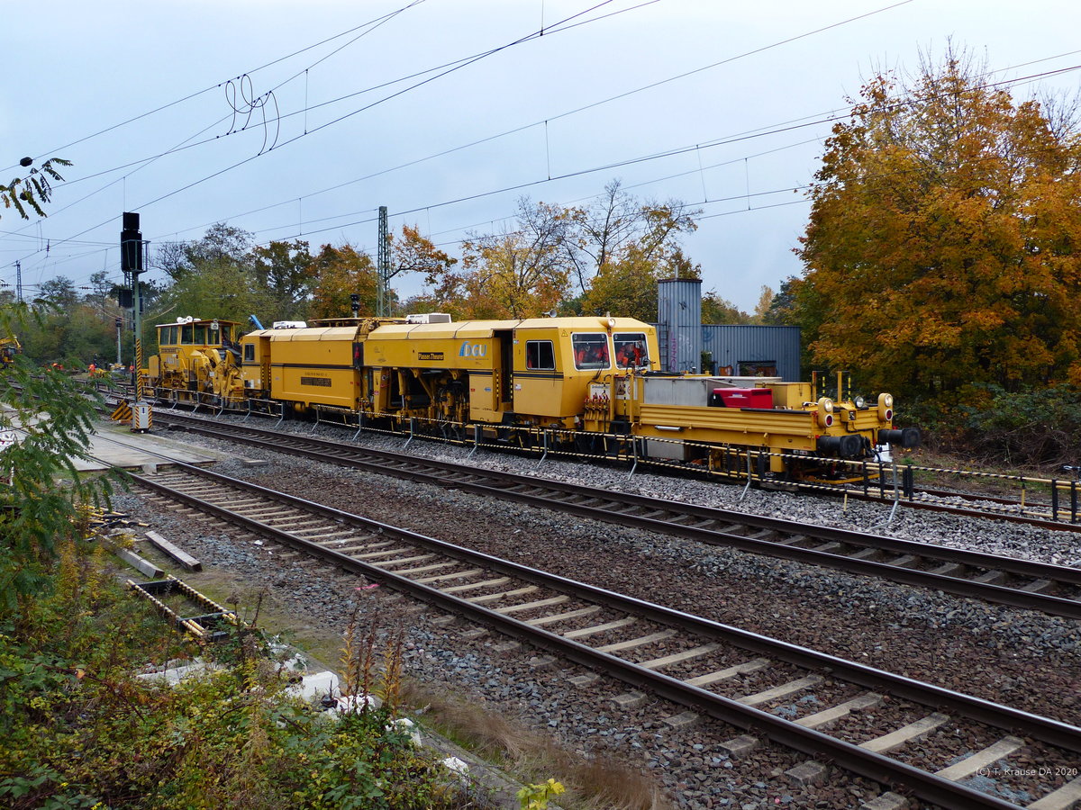 Bahnhof Darmstadt-Eberstadt am 10. November 2019. In der Nacht oder am Morgen wurde die Weiche im Gleis 1 nördlich der Staßenbrücke ausgetauscht und der  Stopfzug  aus Gleisstopfmaschine und Schotterverteil und -profiliermaschien rückt an.