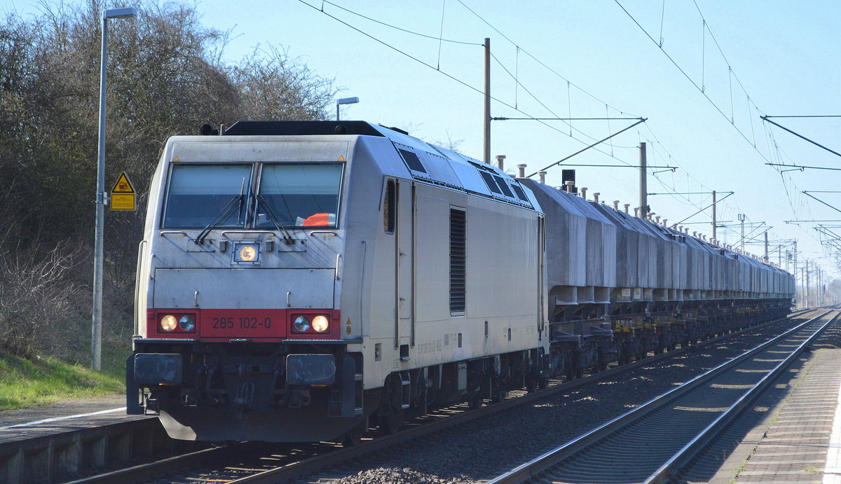 Havelländische Eisenbahn AG, Berlin-Spandau [D] mit "285 102-0" [NVR-Nummer: 92 80 1285 102-0 D-HVLE] mit einem Ganzzug der Spezialwagen der Firma Fels-Werke GmbH der Gattung Slmmps zum Transport von Kalk (Rübeland Bahnstrecke) am 24.03.20 Bf. Wellen (Magdeburg).
