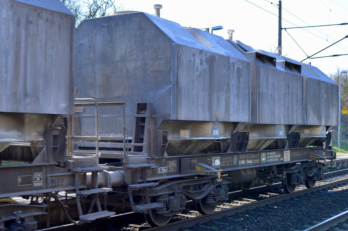 Hier einer der Spezialwagen (Oberbaustoffwagen) der Firma Fels-Werke GmbH (Nr. 3898) mit der Registrierung 84 80 D-FWGs 473 3 244-2 (P) Slmmps Bf. Rübeland zum Transport von Kalkprodukten dieser Firma in einem Ganzzug am 24.03.20 Bf. Wellen (Magdeburg).